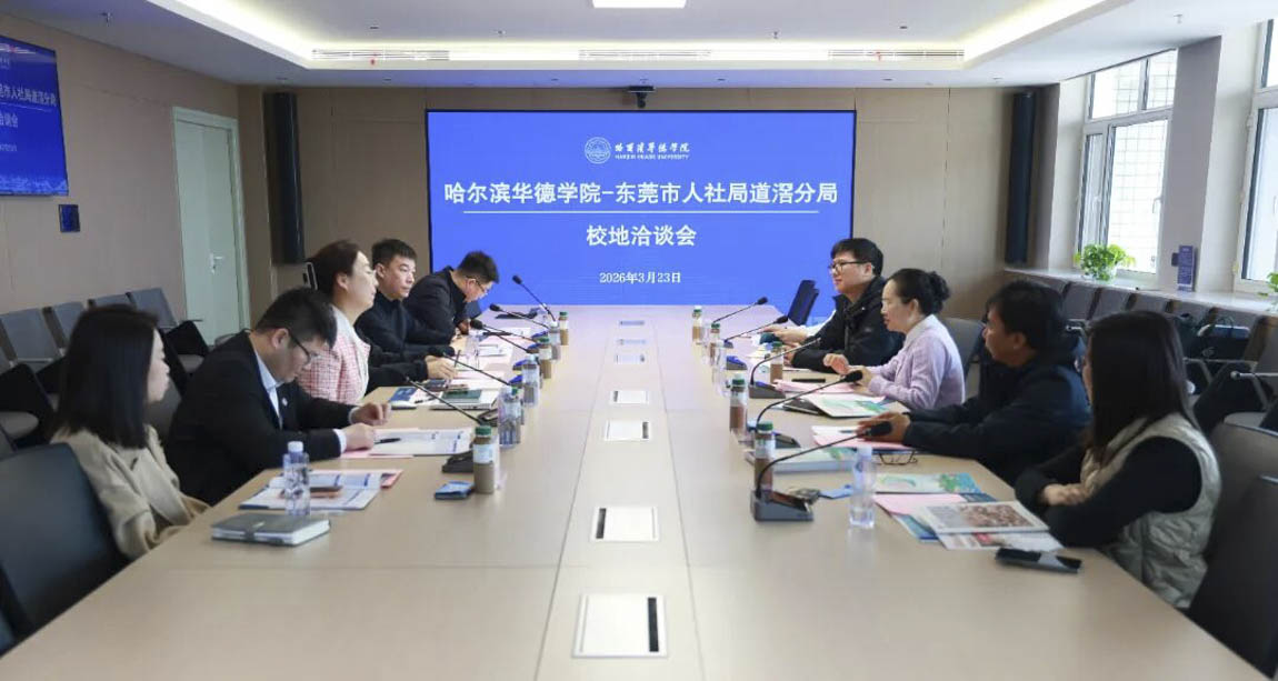为深入贯彻落实党中央、国务院关于促进高质量充分就业的决策部署,认真落实教育部2026届全国普通高校毕业生就业创业工作会议精神及黑龙江省政府、省教育厅关于高校毕业生就业工作的相关要求,哈尔滨华德学院积极推动产教融合与校地协同发展战略,精准对接地方产业人才需求,不断拓宽人才培养与就业渠道。2026年3月23日,学校成功举办哈尔滨华德学院—东莞市人力资源和社会保障局道滘分局校地洽谈会。东莞市人社局道滘分局局长陈海勤一行5人莅临学校交流洽谈。哈尔滨华德学院副校长魏可霏、校长助理朱斌海及相关部门、二级学院负责人出席活动,双方围绕校地合作深入交流,共商协同发展蓝图。